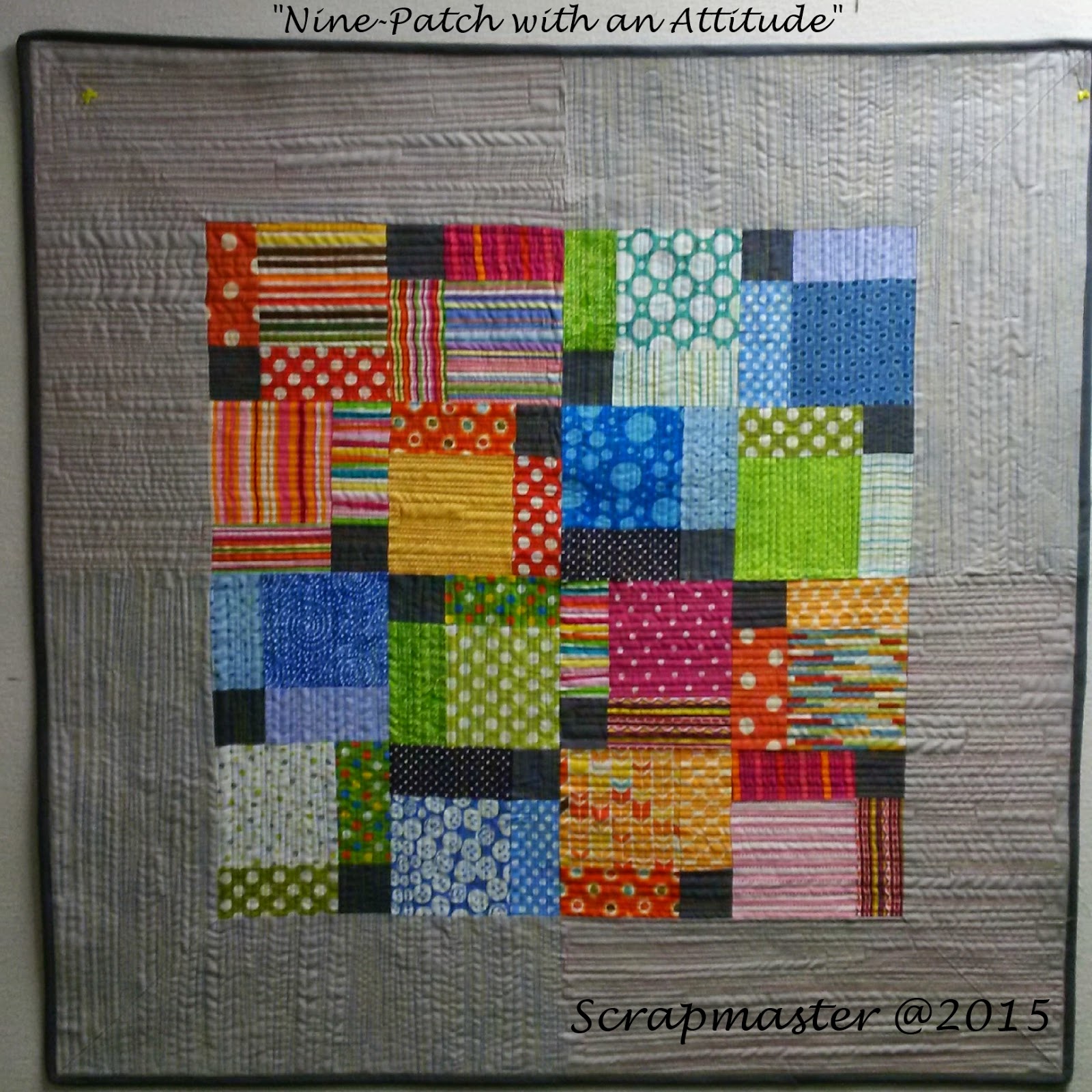 I called it "Nine-Patches with an Attitude" I love nine-patches, what quilter doesn't. I have made a ton of them over the years. In January, my lovely little guild, the Maritime Modern Quilt Guild, had a member swap of 5" squares of dots and stripes. I sorted through the pile of 56 squares that I received and arranged them into colour families. Then I made nine-patch blocks with each one having a dark grey 5" square in the centre. Then I used the disappearing nine-patch method and sliced them up and then sewed them all back together into a pleasing arrangement. I used the orangey/pinkey and the bluey/greeney ones to make my centre (still have a few blocks left over for another project) and then added a light grey around that. I machine quilted with a straight-line jiggity jaggity stitch of my own making, with an orangey/pinkey Sulky variegated thread opposite the orangey/pinkey quadrant and then used a blue/yellow/green Sulky variegated thread opposite the bluey/greeney blocks. I switched up the direction of the quilting as well. What a beautiful texture it made. For the binding (that's a whole other post coming soon) I used Kona Coal and then when sewing it down to the front I used the same thread to correspond with the quilting. First time I ever did that. Love it and it was such fun for me to make.